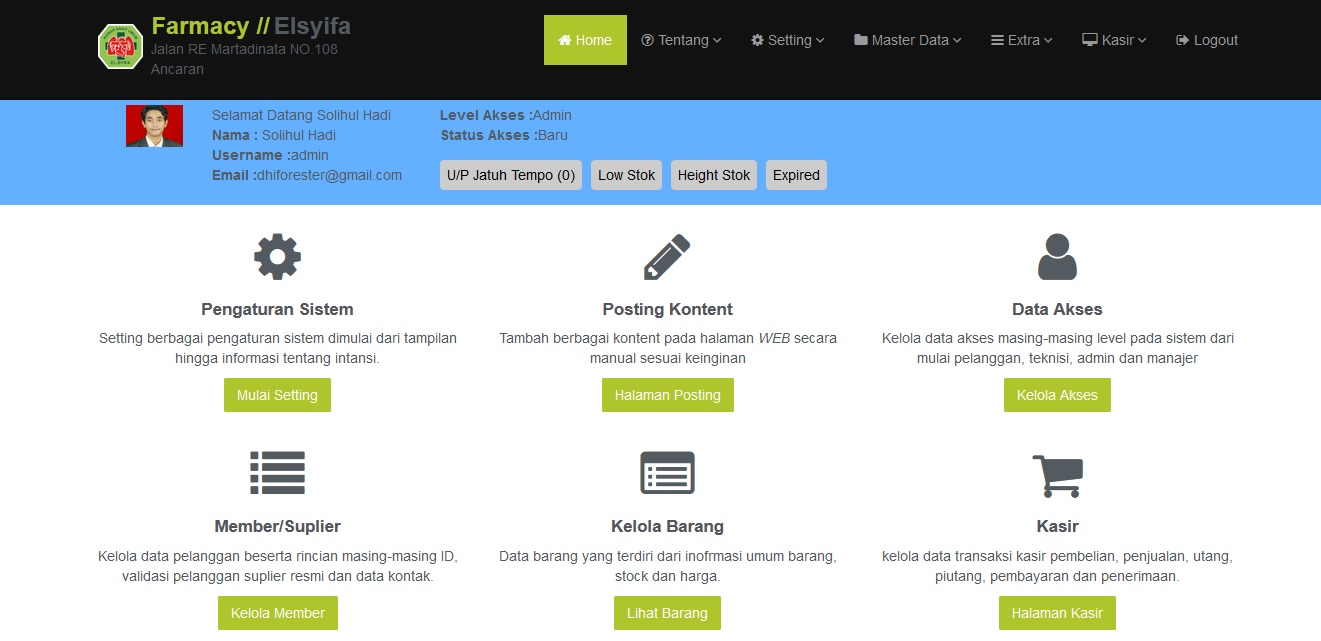Sebelum memulai menggunakan program ini, perlu dipahami terlebih dahulu mengenai cara kerja sistem pada program ini. Secara umum, pengguna pada sistem terbagi menjadi 3 (tiga) jenis pengguna. Diantaranya adalah pengguna tanpa hak akses, pengguna petugas farmasi dan pengguna admin. Pengguna tanpa hak akses tidak bisa melakukan proses pada sistem, hanya bisa melihat data profil sistem secara umum. Pengguna dengan akses petugas farmasi merupakan pengguna yang bisa melakukan proses yang diantaranya pengelolaan data obat, transaksi dan melakukan berbagai aktifitas percetakan. Pengguna admin memiliki hak akses lebih lengkap dan mampu mengendalikan sistem secara keseluruhan.